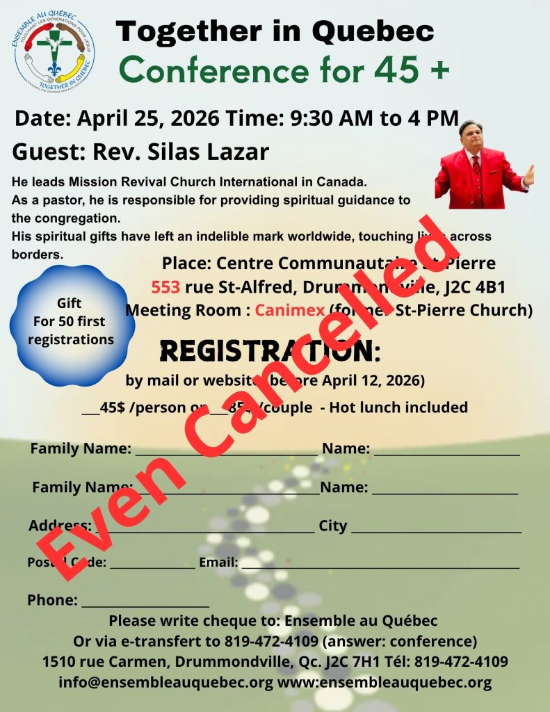 We organise annual conferences in Drummondville the last Saturday of April each year. These are in collaboration with local churches and different evangelical orgatinsations that are ministering in Quebec and Canada.